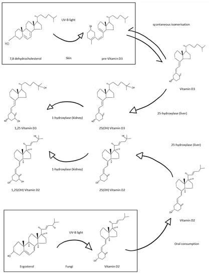 VD is a precursor of the active 1,25(OH)2-VD and is available endogenously in two major forms—ergocalciferol (VD2) and cholecalciferol (VD3). VD2 is available in the diet in a variety of vegetables and fortified foods, while VD3 is present in some animal-based foods. VD3 can also be synthesized in the skin by conversion from 7-dehydrocholesterol in a multi-step ultraviolet-B light-dependent pathway (Figure 1) [,].