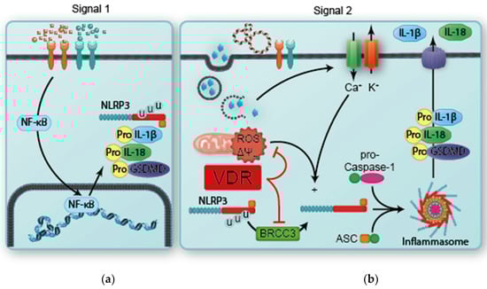 Inflammasome pathways form an integral role in the innate immune system, and inappropriate inflammasome activity is strongly implicated in an array of human disease. Data from genetic studies suggested a role for the VDR affecting inflammasome activity. Al-Daghri et al. showed that a single nucleotide polymorphism (SNP) in the VDR gene is strongly associated with increased inflammasome activity and circulating levels of IL-1β and IL-18 [].