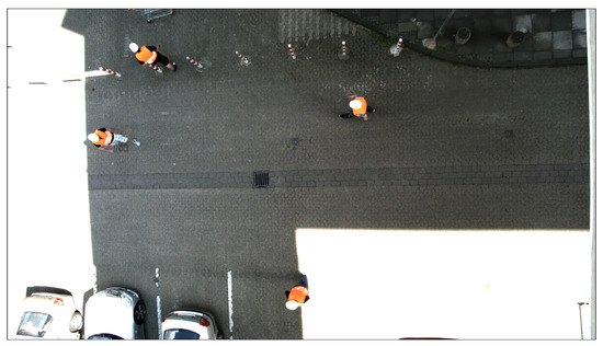 Top-view scenes of construction sites have rarely been recorded. Accordingly, a dataset reasonable for our purpose has not been published yet. For that reason, we recorded video sequences to train and test our approach explicitly for the scope of this paper. It is important to know if different backgrounds and lighting conditions can have an influence on the tracking of construction workers. In addition, we want to test if our approach can distinguish between different moving objects. The videos were therefore taken in two scenarios with different levels of difficulty for our approach: in the first one, construction workers act on a uniformly plastered terrain, whereas a mixture of gravelled and plastered areas is chosen for the second scenario. While the first scene is illuminated well, the second scene is slightly overexposed. Both sequences are recorded by a non-pivoting camera at a height of 20 , which is aligned to the ground and has a fixed position (see Figure 1). This results in a top-view perspective in the center of the image, but becomes oblique at the borders of the image. In accordance with a typical crane camera set up [28], all videos were recorded with a frame rate of 25 fps and a resolution of 1920 × 1080 px. In both scenarios, construction workers wearing safety vests and helmets walk randomly through the camera’s field of view including sudden stops and directional changes. They also interact with static construction specific elements such as pylons and barrier tapes. Of course, exposing workers intentionally to hazardous situations or heavy construction machinery is unwarrantable. Such hazardous situations are substituted by smaller moving vehicles instead which still allows for evaluating the correct classification of moving objects. In both video sequences, the construction workers are manually labeled by hand in order to prepare both the ground truth and the training data. Rectangular areas surrounding the worker’s heads and shoulders are used to indicate the positions of the workers.