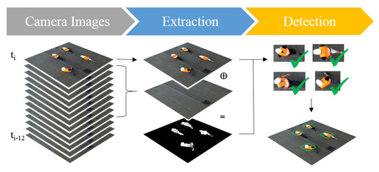 Concept of the classical detection approach. Each time step t corresponds to an image frame. The current frame in time step is subtracted from a background model which is generated from images of the previous time steps. This results in foreground blobs which represent RoIs. Image patches of the current image corresponding to these regions are fed into the classifier determining the presence of construction workers.