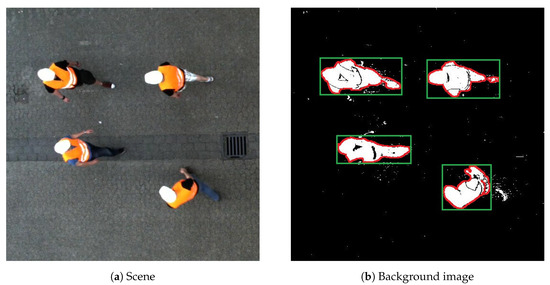 Background subtraction example: (a) video frame of walking construction workers; and (b) background image with white foreground pixels aggregated to blobs of motion (red) and the corresponding RoIs (green) for further processing.