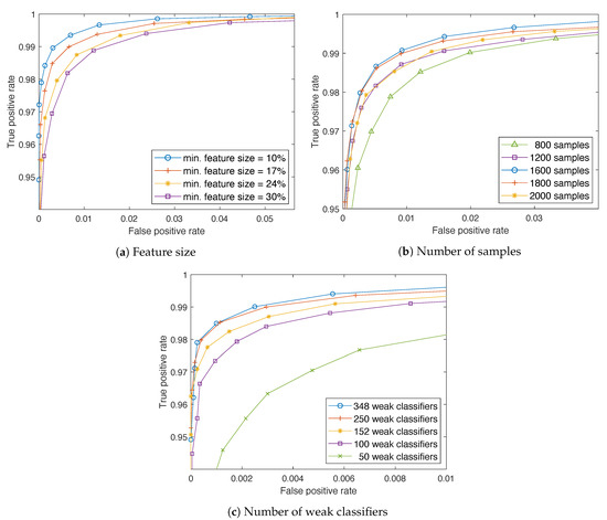 In preliminary experiments, we already found that subdividing the color histograms into five bins is sufficient for the classifier to properly recognize the characteristics of a construction worker’s helmet and safety vest. Other parameters to be investigated include the minimal size of the feature descriptors provided by the feature pool. Too small feature descriptors may affect the classification. The feature descriptors’ sensitivity to noise increases with decreasing size which may impair the classification. Similar results hold for slight translations, rotations and scalings of the object to be detected within the RoI provided by the background subtraction. By this, too small feature descriptors may easily be positioned off the corresponding feature. On the other hand, large feature descriptors may miss small features. For these reasons, we investigate the effect on the feature descriptors’ sizes to the detection quality. We vary the minimal feature size of the feature descriptors provided in the feature pool for training between 10% and 30% of the given image patch size. Additionally, we vary the quantity of training samples from 200 to 2000 to find the optimal generalization behavior. Finally, to speed up the recognition process, we determine the minimum number of weak classifiers required for a reliable classification. For that, we vary the number of weak classifiers constituting our cascade from 50 to 350. To compare the detection results while varying a parameter, we juxtapose the classifiers’ receiver operating characteristic (ROC) curves. For this, we apply the trained classifiers to the validation dataset and plot their true positive rate (TPR) against their false positive rate (FPR) with respect to the particular classifier’s confidence. Figure 6 illustrates the ROC curves for all three parameters. In addition, we calculate the accuracy of the classifier when the number of weak classifiers is varied. During the variation, we apply the classifier to the validation dataset and to the training dataset and plot the accuracy curves. The results are shown in Figure 7.