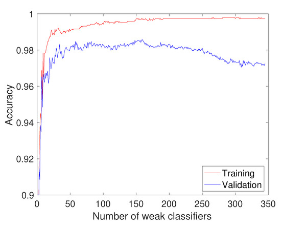 The findings in Figure 6c are also supported by the results in Figure 7. The evaluation up to 150 weak classifiers shows that, in general, the accuracy of the classifier increases. If the classifier contains 152 weak classifiers, it reaches an accuracy of 98% on the validation set. Above 150 weak classifiers, the accuracy of the classifier decreases slightly on the validation set. In contrast, the accuracy increases slightly on the training set. This gives rise to suggesting a slight overfitting.