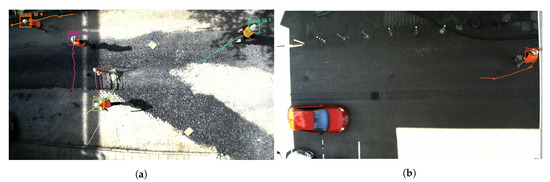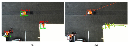 In Scene 2, these effects are much less pronounced since the scene is only slightly overexposed. As the comparison of the AOS shows, the difference in the labels’ overlap of Scenes 1 and 2 is only on average, and, even if the outlier (Track 5) in Scene 1 is disregarded, the difference raises to only about . The average TL in this scene also decreases only moderately compared to Scene 1. By depicting an example of Scene 2, Figure 9a illustrates that the quality of our tracking approach is sufficient even on slightly overexposed scenes. This finding is supported by measuring the TL and the CER. Both do not vary significantly from Scene 1 to Scene 2. All construction workers are consistently tracked almost throughout the entire duration of both scenes. By applying the tracking system to Scene 3, we show its behavior in the case of moving objects which are not pedestrian construction workers. The results for Scene 3 in Table 2 depict that only one track is set up. As graphically confirmed by Figure 9b, this track belongs to the only worker in this scene. The worker is tracked successfully and no further tracks for the non-worker objects are mistakenly generated. Again, the AOS achieved by the classical system is within an acceptable range, and CER and TL confirm that the worker is tracked consistently throughout the whole scene’s duration.
