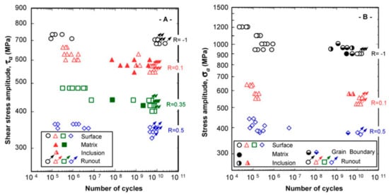 Stress ratio is known to influence the fatigue behavior in the HCF-regime, with higher mean stress reducing the fatigue limit as well as the fatigue lives. This influence is also observed for the fatigue in the VHCF-regime independent of loading type (see Figure 1) [].