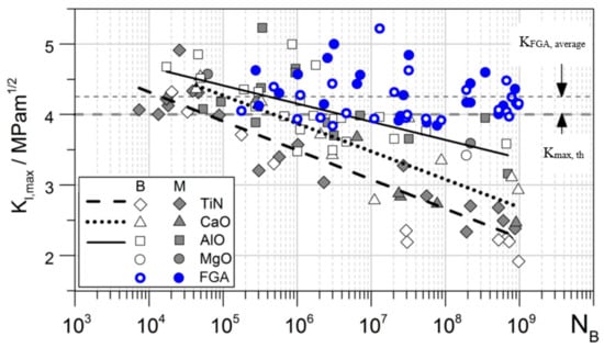 Stress intensity factors of crack-initiating defects (white and grey symbols), as well as the stress intensity factors on the border of the fine granular area (FGA) (blue symbols) [].