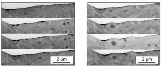 Ion-induced secondary electron images of serial cuts inside the FGA (cut distance 0.2 µm) generated by FIB (ϭa = 875 MPa, Nf = 7.71 × 105) increasing cutting depth from upper left to lower left and upper right to lower right [].