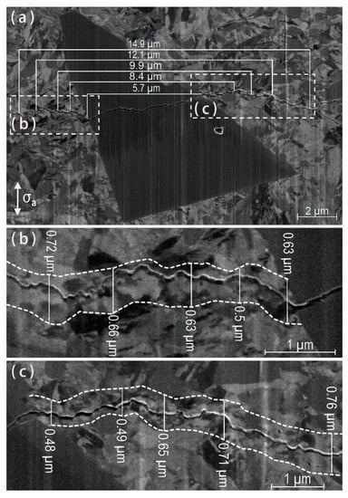 The determined FGA thickness was 500 nm for a SIF of 2 MPam1/2 and up to 1.2–1.4 µm for a SIF in the threshold range for long crack propagation of 4 MPam1/2. The measured thickness of the FGA was additionally compared to the calculated plastic zone size perpendicular to the crack propagation direction and showed good agreement (see Figure 5)