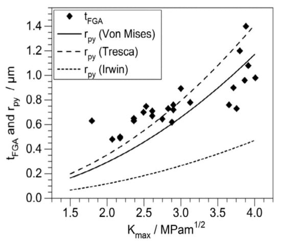 Measured FGA thickness tFGA in comparison to the plastic zone size (plane strain) perpendicular to the crack plane rpy calculated by different plastic zone size models [].