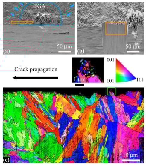 In addition, it is reported that the FGA is not continuously formed on both sides of the fracture surfaces and that a gradient layer with respect to grain size is also formed locally before the crack tip. Therefore, grain refinement is evaluated to be a result of the interaction of dislocations in the immediate vicinity of the crack-initiation site or crack tip because of local high stress. Based on those observations, Song and Sun [] analyzed the microstructure around a previously introduced fatigue crack after an additional compressive fatigue test for the same material, to clarify the influence of repeated compressive stresses between fracture surfaces on the FGA-formation process, by means of EBSD (see Figure 7).
