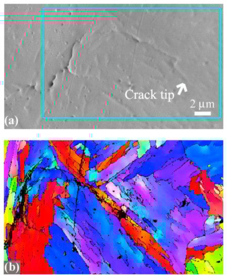 (a) SEM image of the crack tip and the mated crack surface for the specimen after compressive fatigue test on a preciously introduced crack; (b) EBSD inverse pole figure maps for the rectangle region in (a) [].