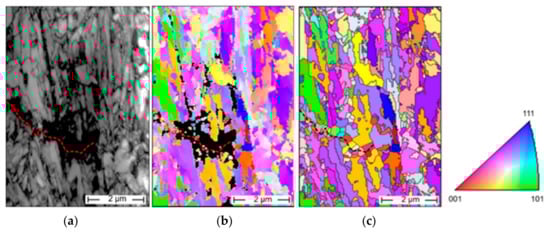 (a) Indexing confidence map of the analyzed area around a VHCF crack given by a dashed red line with FGA; (b) IPF-Map of the analyzed microstructure along the crack; (c) reconstructed grains boundary image of the microstructure, based on the reliably indexed grains from the IPF-Map in (b) [].