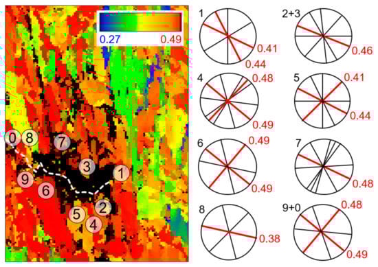 Map of the highest Schmid factors for the sliding system {110}/<1–11> and the traces of the {110} sliding planes in the areas 0 to 9, whereby the planes with the highest Schmid factor are marked in red and labelled with the corresponding values [].