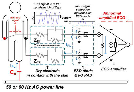 The generation of PLI and the saturation effect of the electrostatic discharge (ESD) diode is shown in Figure 1. The PLI is mainly generated by a displacement current, IPL, through a capacitive coupling between a human body and the power line. Since the PLI can be more than a few volts, depending on the mismatch of skin–electrode contact impedance, the ESD diode of an input/output (I/O) pad can be put into a turned-on state by the PLI. A turned-on ESD diode makes an input CM signal reach the supply and ground level, which means that input CM voltage is out of the saturation range of the input transistor of the ECG amplifier. In this case, the ECG amplifier cannot amplify the raw ECG.