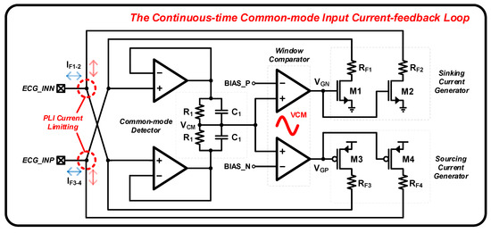 A block diagram of the proposed continuous-time CM input current-feedback loop is shown in Figure 3. The proposed circuit is implemented to clamp unwanted PLI in the saturation range of the input transistor, which can normally be amplified by the current-reused CFIA. The main idea of the proposed circuit is that the sourcing and sinking feedback current can limit the input displacement current caused by PLI if an input CM voltage is out of the bias range between bias voltages, BIAS_P and BIAS_N. Through this procedure, an input CM voltage including PLI is clamped.