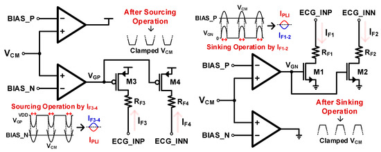 If VCM is over BIAS_P, the feedback sinking current from the NMOS flows into ECG input nodes, ECG_INP and ECG_INN, which leads to IF1-2 limitation so that VCM is the same BIAS_P.