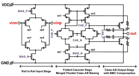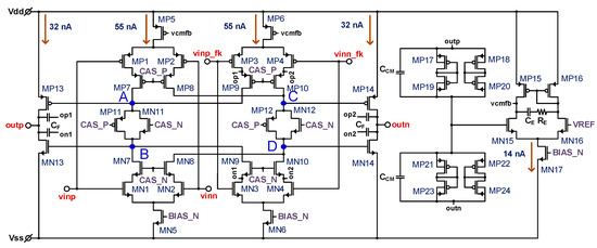 The inverter-based differential-difference cascode input stage is cooperatively biased by the current sources MP5-6 and MN5-6. After biasing, the trans-conductances of the stacked NMOS and PMOS differential input pair are merged, which leads to amplification of the input signal with high Gm/Id efficiency. In addition, the cascode amplifiers MN and P7-10 are implemented to obtain high open-loop gain by increasing the impedance at nodes A–D. Assuming symmetric elements have the same small signal parameter, the impedance at nodes A–D is briefly expressed using the following equation: