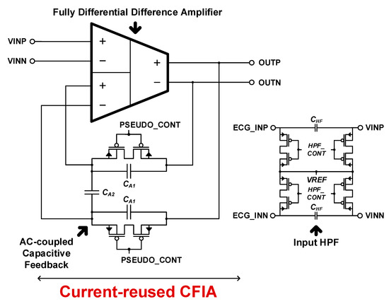 The current-reused CFIA has very high input impedance by the current-feedback topology, therefore, it can be robust to signal distortion. In addition, due to the structural characteristics of a fully differential difference amplifier (FDDA), a high CMRR can be achieved. To reduce low frequency noise, such as baseline wander, which is another main source of noise in ECG measurement, an alternating-current (AC)-coupled capacitive feedback loop is implemented in the current-reused CFIA.
