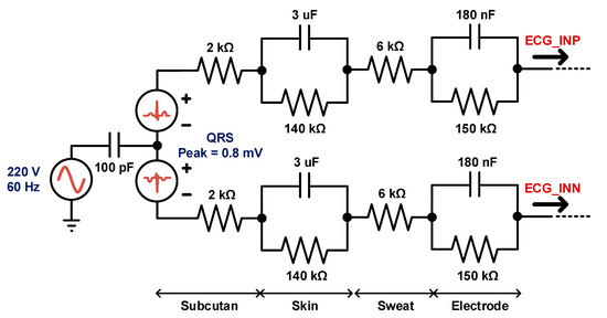 A simulation of the setup for ECG monitoring that considers dry electrode–skin contact is shown in Figure 9. For simulation of the ECG monitoring, an ECG/PLI signal generator, a capacitive coupling for PLI, and an equivalent circuit model of the dry electrode–skin interface were used [14]. The word “subcutan” expressed in Figure 9 is a shortened form of “subcutaneous”.