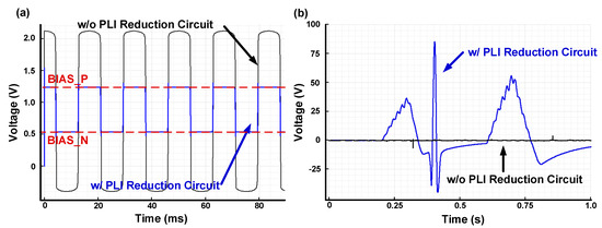However, with the proposed PLI reduction circuit, the ECG input is clamped with BIAS_P and BIAS_N, and the saturation effect does not occur. Figure 10b shows the amplified ECG signal by the current-reused CFIA according to the presence or absence of the proposed PLI reduction circuit. Abnormal ECG amplification occurs when the proposed PLI reduction circuit does not exist, but if the proposed PLI reduction circuit does exist, normal ECG amplification is possible.