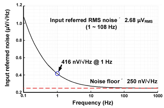 Simulated results of the input-referred noise of the current-reused CFIA are shown in Figure 11. The input-referred root mean square (RMS) noise of the current-reused CFIA has 2.68 μVRMS with the 107 Hz of bandwidth.