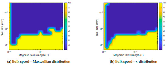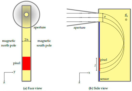 As a minimum requirement, the z dimension of the MPA’s magnetic chamber must be longer than two curvature radii associated with the fastest particles. Similarly, the x dimension must be deeper than one curvature radius (see Figure 1b). According to this requirement, the minimum dimensions of the instrument also depend on the magnetic-field strength, which defines the curvature radius. Keeping the remaining parameters constant, an increase of the magnetic-field strength increases the number of particles detected on each pixel, leading to a smaller statistical error in the measurement. However, it also increases the relative error in velocity measurements according to Equation (25). The MagEIS instrument provides us with a reasonable starting point for an achievable magnetic-field strength. The MagEIS properties are summarized in Table 1. We choose for MPA a starting value of 0.1 T. In Section 3, we study the influence of the magnetic field strength on the overall performance of our instrument.