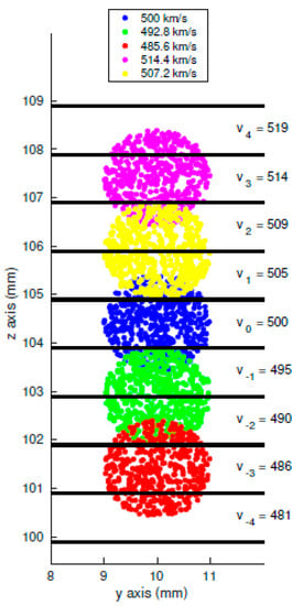 This expression is based on the assumption that the aperture is reduced to a point and that the particle velocity before entering the aperture is parallel to the x axis. In Section 3, we discuss the influence of the aperture size on the velocity determination. A second advantage of this sensor position, apart from having the highest velocity resolution, is the first-order focusing property which states that all particles with velocity and within a small solid-angle element are focused onto the same hit position in the sensor plane. We demonstrate this property for a particle with and . According to Equation (1), we obtain: