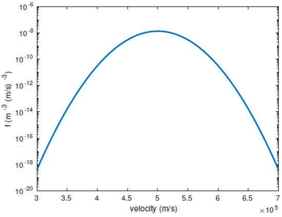 Maxwellian VDF with density 5 cm, temperature 100,000 K and bulk speed 500 km/s. This distribution function serves as the input for our calculations in Section 3.2.