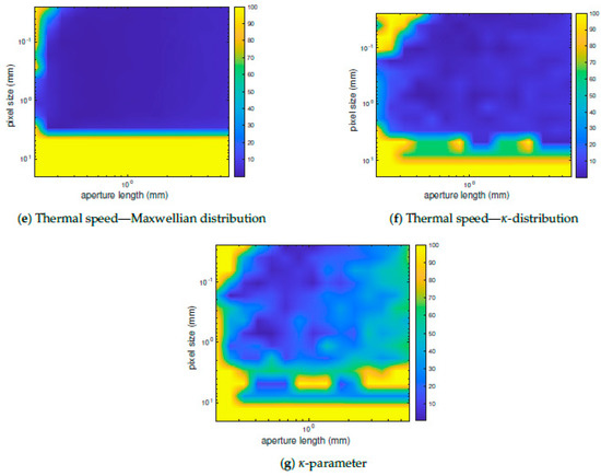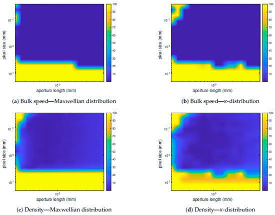 We conduct test-particle simulations to quantify the relative errors made on VDF parameters for different aperture sizes and pixel sizes. We assume an idealized homogeneous magnetic field inside the instrument and use Equation (4) to determine the hit position of the particles. We inject particles with a Maxwellian distribution and a -distribution starting with a uniform distribution of particle locations on the instrument’s disk aperture. We represent both input distributions (Maxwellian and -distribution) in Figure 6. We obtain estimates of the VDF parameters such as number density (n), thermal speed () and bulk speed (U) by fitting, using a Levenberg–Marquardt algorithm, for every set of aperture and pixel size. For the -distribution, we require a fourth parameter, the -index. We run these simulations for different types of solar wind: slow, intermediate and fast. The instrument and solar wind parameters are summarized in Table 3.