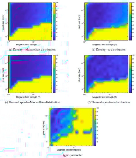 Relative errors in percent made on an intermediate solar wind with magnetic field and pixel size. Panels (a) through (g) show the resulting relative errors for all of the fit parameters of the Maxwellian and -distributions.