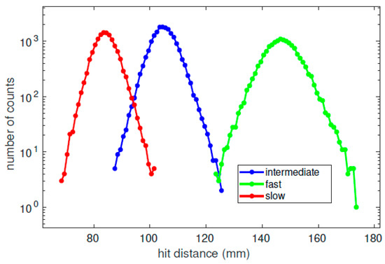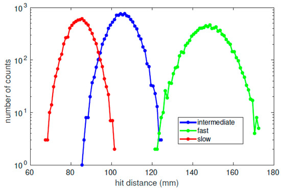 Figure 1b illustrates the trajectories of three ions inside the chamber. According to Equation (3), the curvature radius of the particles is directly proportional to their . Assuming that all particles are protons and knowing the magnetic field strength , it is thus possible to measure the speed of the particles directly by measuring their curvature radius, represented by their hit distance in the sensor plane.