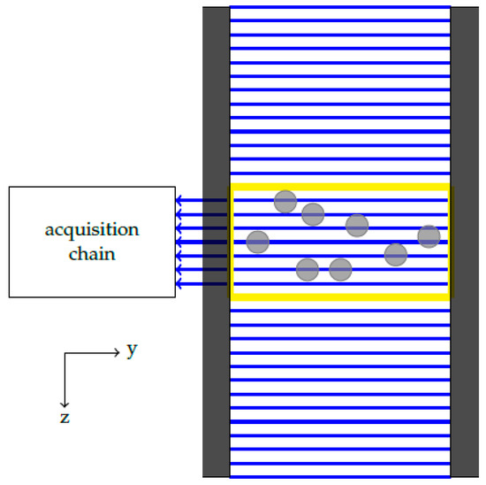 Position-sensitive anodes and a representative pixel. The anodes are represented by the blue lines. They consist of conductive wires that detect the current generated by the electron beams (gray circles) and determine the vertical z position of the beam based on the knowledge of which wire has been hit. A pixel is defined as either a single anode or a collection of multiple anode wires and is represented here as a yellow rectangle. The two permanent magnets, which delimit the magnetic chamber, are represented by the dark rectangles at both sides of the pixels.