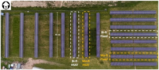 Aerial view of the test facility. There are eight horizontal single-axis trackers (HSATs) and eight fixed-tilt rows. The bifacial (bi-fi) and monofacial (mo-fi) systems investigated in this paper are highlighted in white and orange, respectively.