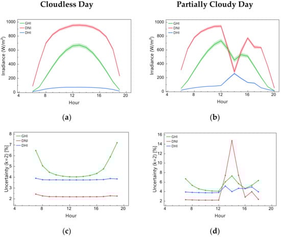 Uncertainty of the hourly GHI, DHI, and DNI measurements performed onsite from two example days in April 2019. A cloudless day is shown in (a) and (c) and a partially cloudy day is shown in (b) and (d). The top row shows the absolute uncertainty (in W/m2) as shaded bands around the measured value. The bottom row shows the uncertainty in percentage.