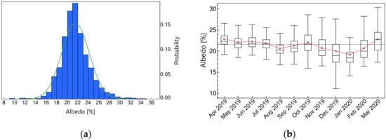 (a) Distribution of albedo measurements made during the one-year period; (b) Box and whisker plots of the monthly albedo, the red line connects the mean monthly albedo, the dashed reference line shows the annual average of 21.6%.