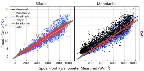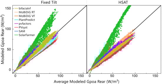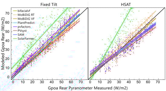 A comparison of the modeled GPOA,Rear during five weeks (21 February–30 March 2020) where measured GPOA,Rear data are available on the fixed-tilt and HSAT system is shown in Figure 6. The simulated results include reflection losses at the PV glass–air interface according to the IAM model implemented in each software. The solid black 45° lines in Figure 5 represent unity to the measurements. The measurements are the average of two MS-40 pyranometers (EKO Instruments, Tokyo, Japan) mounted on the backside of the structure: east and west in the case of the HSAT, top and bottom for the fixed tilt (Figure 2d).