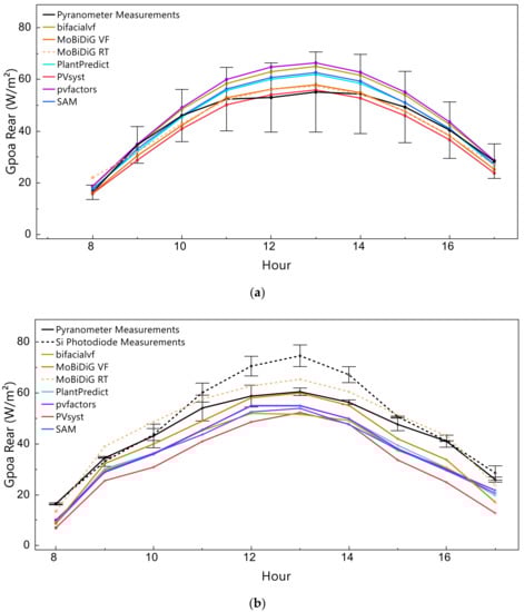 In the HSAT scenario, we do not see the same level of model agreement (Figure 7b). We observed that the irradiance sensor closest to the sky (i.e., western sensor in the morning, eastern sensor in the afternoon) typically receives more irradiance than the pyranometer closest to the ground, which is consistent with the findings of [22]. We found that the differences between eastern and western GPOA,Rear measurements on the HSAT system were not as extreme as differences between the top and bottom GPOA,Rear measurements on the fixed-tilt system. On a clear sky day, we observed differences on the order of 10 W∙m−2 between western and eastern pyranometers. Although five of eight software agree within 5 W∙m−2 of each other, none of the same five tools overlap with the measurement uncertainty bars in Figure 7b. This result could likely change if alternative backside pyranometer locations were chosen. Therefore, the PV industry could benefit from a standardized best-practice protocol for mounting the rear plane of array irradiance sensors in bifacial PV monitoring systems.