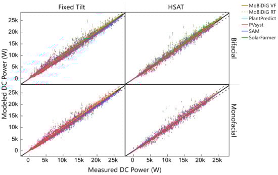 Regressions of hourly modeled versus hourly measured DC power of four the four PV system types studied. Result from six different software are shown. Data points recorded when the sun elevation was less than 5° above the horizon were removed from these plots.
