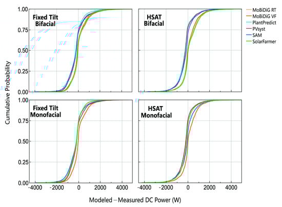 Cumulative distribution functions of the modeling error observed in DC power. Results from four system types and six software are shown. These plots are generated using the residuals from Figure 8.