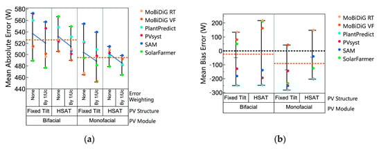 (a) Variability plot showing the mean absolute error of DC power for the four PV system types as simulated by six software. The chart displays unweighted error and error weighted by the inverse of the uncertainty of the solar radiation measurements. (b) Variability plot showing the mean bias error of DC power. Only the unweighted error is shown in these plots. The dashed orange lines show the mean error of the bifacial and monofacial arrays.