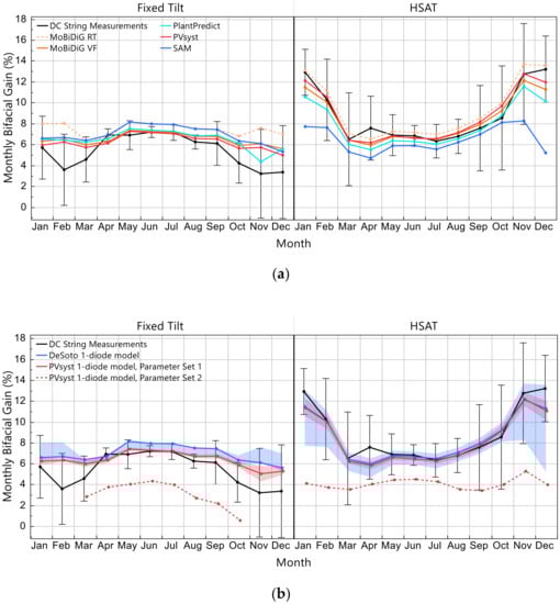 Monthly bifacial gain on fixed-tilt and HSAT systems calculated with Equation (1). All plots show bifacial gain as simulated by five software and from DC string measurements. The black error bars show the inner quartile range of daily bifacial gain measurements within each month. Datapoints when sun elevation is lower than 5° above the horizon are not included in these plots. (a) Results grouped by software (Table 1). (b) Results grouped by which 1-diode model and parameter set was used. PVsyst Parameter Set 1 is based on laboratory I-V measurements at multiple irradiances while PVsyst Parameter Set 2 is based on only STC measurements.