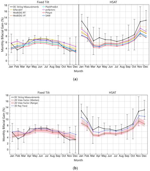 Monthly bifacial gain on fixed-tilt and HSAT systems calculated with Equation (2). All plots show bifacial gain as simulated by seven software and from DC string measurements. The black error bars show the inner quartile range of daily bifacial gain measurements within each month. Datapoints when sun elevation is lower than 5° above the horizon are not included in these plots. (a) Results grouped by software (Table 1). (b) Results grouped by whether a 2-D view factor or 3-D ray trace approach was used to calculate back side irradiance.