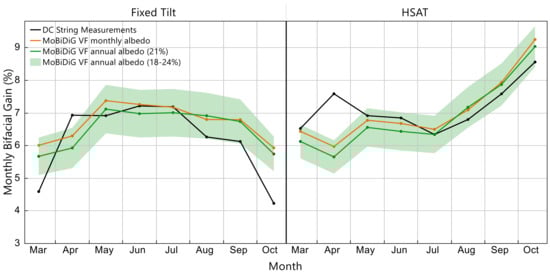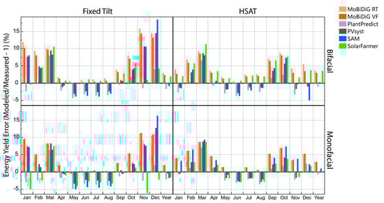Figure 12b shows the results grouped by whether GPOA,Rear is calculated using a 2-D VF or 3-D RT approach. When visualized in this manner, it becomes clear that the 3-D RT approach follows the measured bifacial gain most closely for the HSAT simulation, within 0.5% of measurement for most months outside of winter. The 3-D RT model also matches well, typically within 0.5%, with the bifacial gain measurements on the fixed-tilt system. However, 2-D VF models, such as the one integrated in SAM, compared equally well to field measurements. Indeed, the measured bifacial gain shown in Figure 12 is influenced by the value of Bifiloss. The static Bifiloss values used here, in actuality, change dynamically over the day with the prevailing conditions [19,57,58]. All the commercial software tested here has the capability to use only a single value. This simplification offers room to improve the accuracy of the bifacial PV performance simulation tools used in industry today.