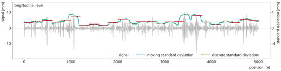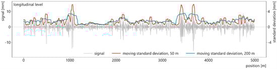 Greater influence lengths blur short-track irregularities and show a broader picture of track quality. Shorter influence lengths highlight isolated defects and follow the original signal more closely [24]. Figure 2 visualizes the moving standard deviation of the same signal as before (longitudinal level of the test section, left rail), calculated once with a 50-m and once with a 200-m influence length.