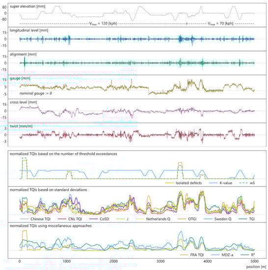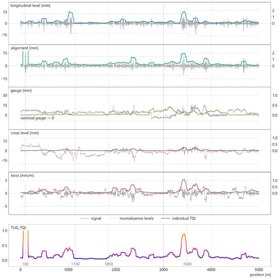 In this section, the track quality of Graz University of Technology (TUG_TQI) is applied on the introduced 5-km test section (Figure 7), thus providing a visual representation of the methodology. By means of this graph, the qualities of the new index are then discussed. The plot includes measurement signals of the track section, the individual indices of the geometry parameters, and the holistic TUG_TQI.