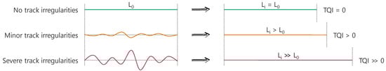 The principle of the FRA TQI, and therefore of the TUG_TQI, is calculating the space curve length Li of a measurement signal. This length is put in relation to the base length L0, which represents the theoretical situation of a perfect track without any irregularities. The more irregularities occur on a segment and the higher their amplitudes are, the longer the space curve length Li is. Consequently, the resulting index will also be higher (Figure 4). [33,35]