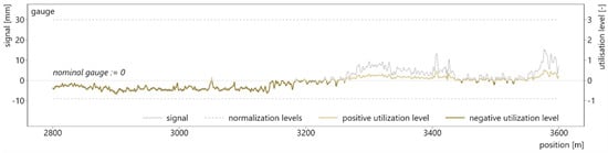 In a first step, the gauge signal is dissected into a positive and a negative part along the zero line. This is a necessary preparatory work for the subsequent normalization process, because of the different threshold levels for positive and negative measurements (gauge narrowing and gauge widening). Next, all measurement signals are normalized with respect to a predefined threshold level, e.g., the intervention limits of EN 13848-5 [26] as in this paper. Only then can signals featuring different units and value ranges be combined to a holistic index without weighting factors. For example, the longitudinal level [mm] has less strict tolerances in absolute terms than the twist [mm/m] and therefore typically exhibits higher amplitudes. The affect a longitudinal level signal has on a combined index would thus be stronger, while a certain twist value, even if lower in its absolute value, might be significantly more critical for the overall track quality. In order to normalize the signals, the measurement values are divided by their absolute threshold values. Different threshold levels (e.g., alert level versus intermediate action level [26]) increase or decrease the TQI while its characteristics remain largely constant. Because of the normalization process, the TUG_TQI is calculated with utilization levels rather than signal amplitudes, and it implicitly considers the maximum line speed, which (co-) defines the threshold values. Figure 6 illustrates the normalization process by means of the split gauge signal.