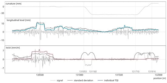 The uppermost signal in Figure 8 represents the curvature in mm, which depicts the line routing. The section consists of a straight track from the beginning to km 131.055, a curve between km 131.160–131.710 as well as transition curves in between. As for the longitudinal level, standard deviation and individual TUG_TQI are almost equal (neglecting the absolute level). This can be interpreted as validation of the TUG_TQI, as the standard deviation is a well-established parameter. However, disparities between the two methods are evident when applied on the twist signal. The standard deviation of the twist overvalues transition curves (km 131.055–131.160, km 131.170–131.916), even though the characteristics of the measurement signal are inconspicuous; it only scatters around a different but uncritical level. In these areas, the TQI_twist represents the measurement data more reasonably. Overall, the TUG_TQI is similar to the standard deviation if the measurement signals are not affected by transition ramps and gauge widening in curves. However, the TUG_TQI is better suited for discriminating between effects originating from either influences of this kind or poor track quality.