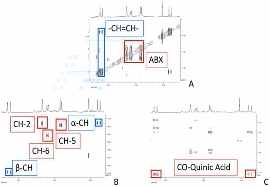 Details of TOCSY (A), HSCQ (B), and HMBC (C) spectra of the hydroalcoholic extract with evidence of the diagnostic resonances of chlorogenic acid.