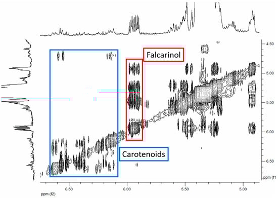 TOCSY spectrum of the chloroform extract with evidence of the diagnostic resonances of falcarinol and carotenoids.